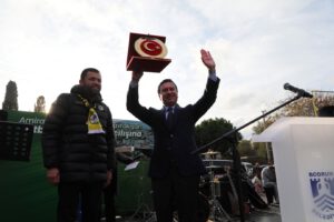 Konuşmanın ardından Mehmet TOP ve Turgutreis Spor Kulübü Başkanı Melih Aydoğan tarafından Belediye Başkanı Ahmet Aras’a teşekkür plaketi takdim edildi.