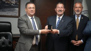 Belediye binasında önceki dönem belediye başkanı Muhammet Tokat ve belediye personeli tarafından coşkuyla karşılanan Topuz, Tokat’a çiçek takdim etti.