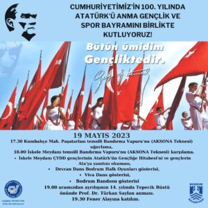 Çağdaş Yaşamı Destekleme Derneği Bodrum Şubesi,  Cumhuriyetimizin kuruluşunun 100. Yıl kutlamaları çerçevesinde Bodrum Belediyesi desteğiyle düzenlenen 19 Mayıs Gençlik ve Spor Bayramı etkinlikleri ÇYDD gençleri, üyeleri ve gönüllüleriyle birlikte coşkuyla kutlayacak.