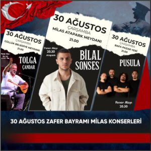 Zafer Bayramı’nda üç farklı noktada düzenlenecek konserlere tüm vatandaşları davet eden Milas Belediye Başkanı Muhammet Tokat, “Hem cephede hem de çağdaşlaşma yolunda birlik ve beraberlik içinde verilmiş olan mücadeleleri bir an olsun dahi aklımızdan çıkarmadan vatanımızı korumak, Atatürk’ün izinden ayrılmadan cumhuriyetimize ve bağımsızlığımıza sonsuza dek sahip çıkmak hepimizin ortak sorumluluğudur. Milas Belediyesi olarak bu yıl da Zafer Bayramı’nı büyük bir coşkuyla kutlamak için hazırlıklara başladık. Güllük, Bafa Pazar Yeri ve Milas Atapark’ta saat 21.00’de başlayacak konserlerimize ve konserler öncesinde saat 20.30’da başlayacak fener alaylarına tüm halkımız davetlidir.” dedi.